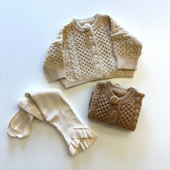 長く着ていただけるよう、綿で編み立てたケーブルのカーディガン。